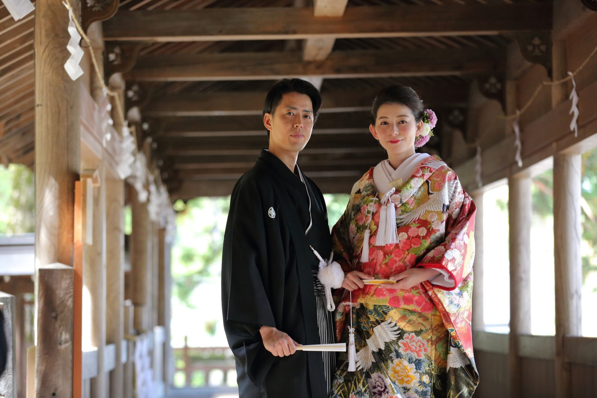 大社の厳かな雰囲気の中、お2人の艶やかな和装姿に、観光客の皆さんからもため息や歓声が。お互いを思いやるお気持ちあふれた、本当にお似合いのお2人でした。遠方よりお越しいただき、大変嬉しく思います。
